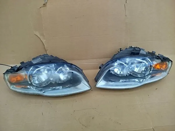 Par de faros Audi A4 B7 usados (derecho + izquierdo) en versión inglesa. Un soporte superior está agrietado. Números de pieza OEM: 8E0941003AK, 8E0941004AK.
