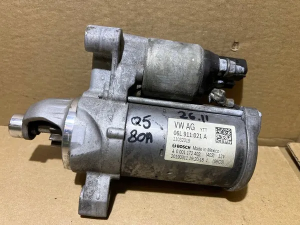 Motor de arranque de un Audi Q5 80A 2.0 TFSI. Pieza original usada en estado de funcionamiento. Estado visible en las fotos. Número de pieza: 06L911021A.