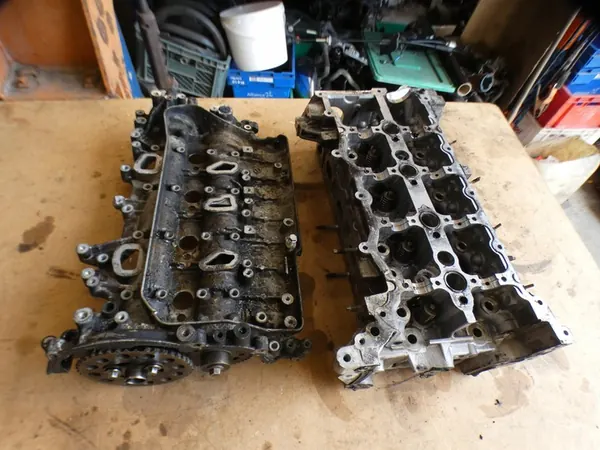 Cabeza de motor con árboles de levas y tapa para Renault Master IV, años de modelo 2017-2021. La pieza es usada y muestra signos de daño, incluyendo una instalación quemada como se muestra en las fotos y una rosca dañada. Este componente proviene del desmantelamiento y es adecuado para vehículos diésel. Número de pieza OEM: 110422750R.