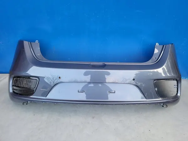 Paragolpes trasero original usado con rejilla izquierda para KIA CEED II hatchback, años modelo 2015-2018. Número de parte: 86611-A2600. El paragolpes tiene todos los puntos de montaje. Los soportes del lado izquierdo han sido soldados (como se muestra en la foto). Hay rayones visibles. La rejilla tiene todos los puntos de montaje y muestra rasguños visibles. El paragolpes incluye aberturas para sensores de estacionamiento.