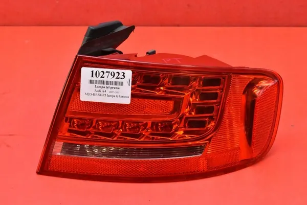 Lámpara trasera derecha para Audi A4, índice: 1027923. Compatible con modelos de 2007 a 2011. Año de producción del vehículo: 2011. Número OEM: 8K5945096K. Estado: Usado con rasguños. Todas las piezas provienen de una fuente legal y se almacenan en almacenes secos para evitar condiciones climáticas adversas. Las imágenes muestran el estado real del artículo.