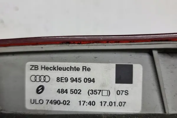 Lámpara trasera izquierda usada para AUDI A4 (8EC, B7) de 2006. Esta pieza es un componente de fabricante de equipo original (OEM), identificado por el número de parte 8E9945094. Es adecuada para automóviles de pasajeros y está en buen estado. Se puede emitir una factura de IVA a solicitud.