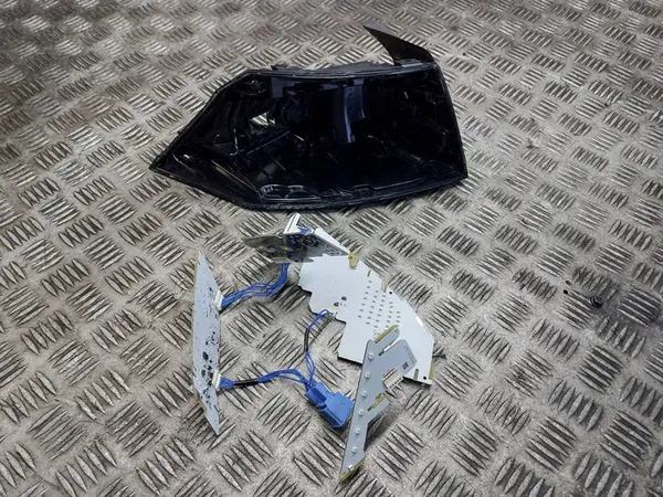 Luz LED trasera izquierda usada para Volkswagen Passat B8 Lift, modelo 2020. El artículo proviene de un despiece y ha sido inspeccionado visualmente antes del envío. La carcasa está agrietada, como se muestra en las fotos, y hay daños en el conector. El precio incluye la carcasa y las tiras LED visibles en las imágenes.