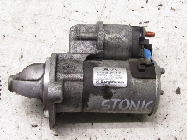 Motor de arranque para Kia Stonic 1.0 T-GDI. Número de pieza: 36100-04270. Marca: Kia. Tipo de combustible: Gasolina. Cilindrada: 998 cc. Potencia del motor: 100 hp. Tipo de transmisión: Manual. Kilometraje: 45198 km. Código de pintura: ABT. Pieza usada. Artículo original de fábrica.