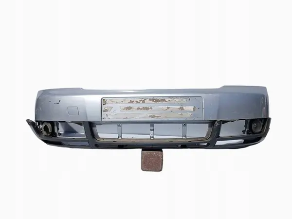 Parachoques delantero completo para Audi A4 B6 Sedan Kombi en plata. El parachoques incluye una viga plateada y una luz antiniebla inferior. El spoiler está agrietado y no es adecuado para su uso. Condición: Usada.