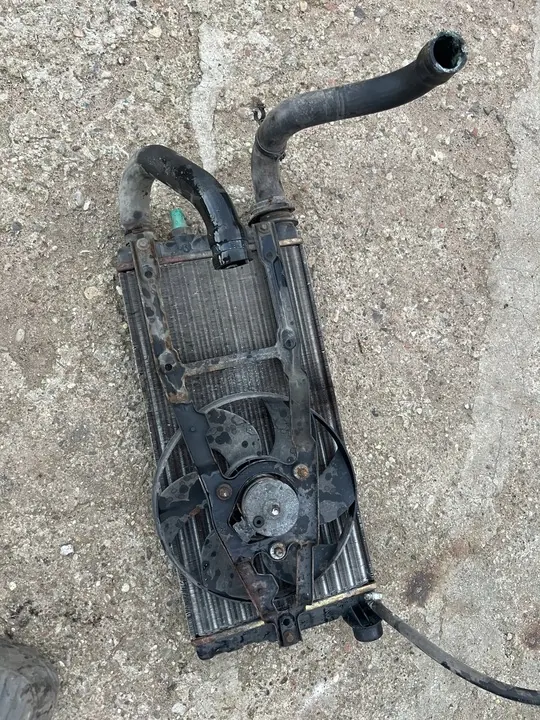 Radiador de agua original con ventilador para los modelos Fiat Cinque y Seicento con motores de 0.9/1.1. El radiador es usado, está en buen estado y no tiene válvula de purga. El ventilador es funcional. También están disponibles piezas adicionales como mangueras, soportes de montaje y una viga de refuerzo frontal. Las piezas provienen del desmantelamiento y muestran signos de almacenamiento y uso.