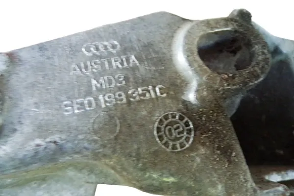 Soporte de motor izquierdo usado para AUDI A4 (8E2, B6) con un motor diesel de 1.9L (96kW) del año 2000. La pieza es un componente de equipo original (OEM), identificado por el número de catálogo 8E0199382D. Incluye el logo del fabricante, asegurando calidad. Los números de piezas de reemplazo incluyen 8E0199351C. Se emitirá una factura de IVA al realizar la compra.
